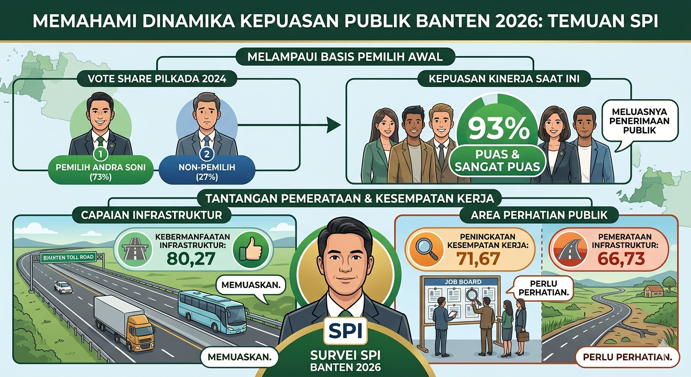 Hasil survei menunjukkan bahwa Indeks Kepuasan Publik terhadap kinerja Gubernur Banten Andra Soni mencapai 77,33, yang masuk dalam kategori memuaskan. Temuan ini menunjukkan bahwa masyarakat menilai kinerja pemerintahan Provinsi Banten berada pada jalur yang positif dalam menjalankan agenda pembangunan daerah.